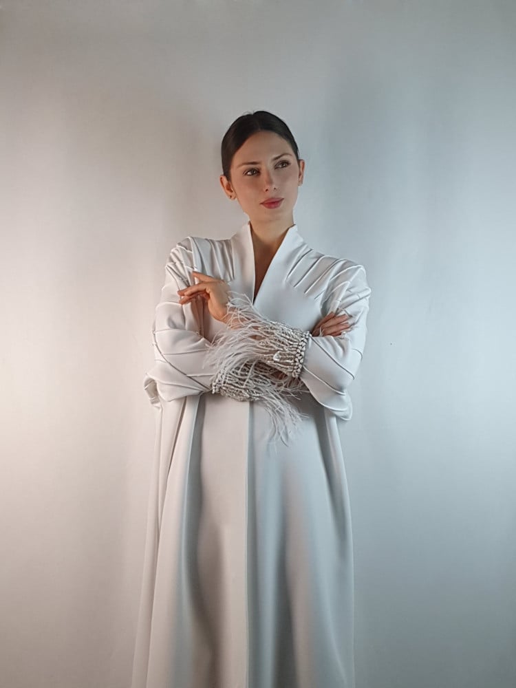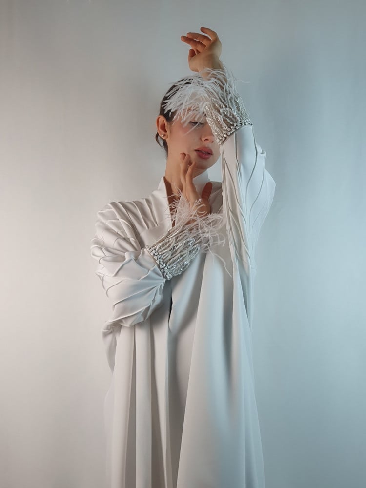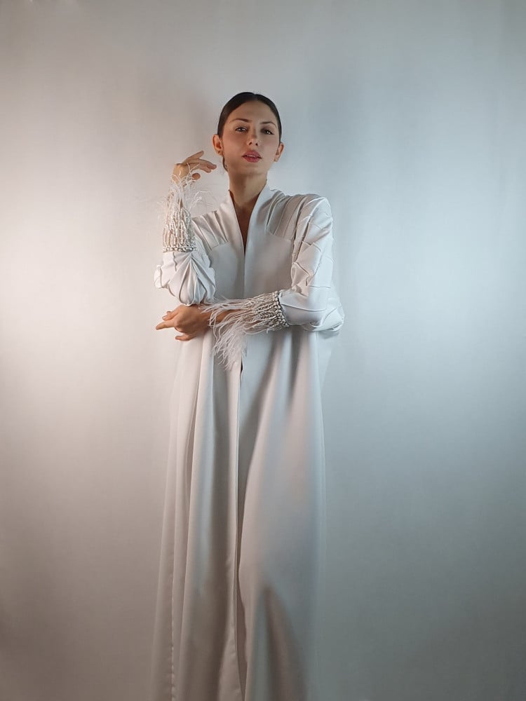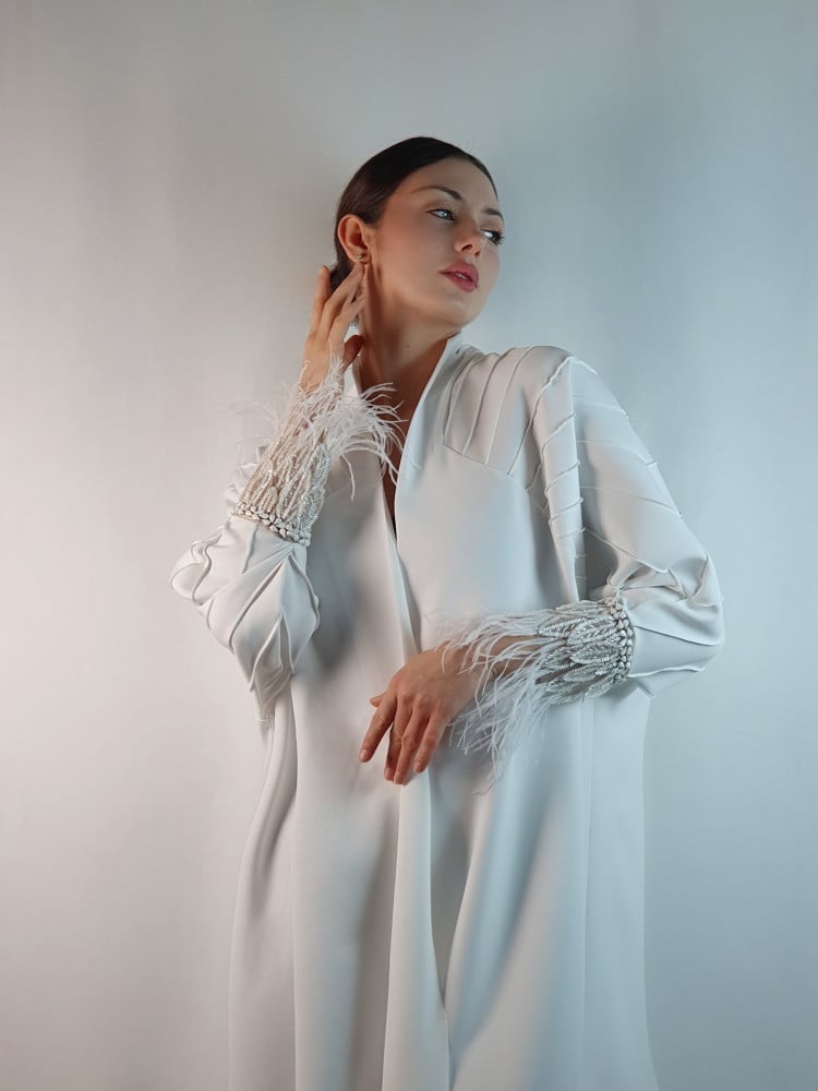عباية بالطلب مصنوعة من افخم انواع الكريبذو الملمس الباردتطريز يدوي بالاحجار البيضاء والريش فالاكمام عباية+طرحة نفس اللونمقاس العباية على الموديل: S/M